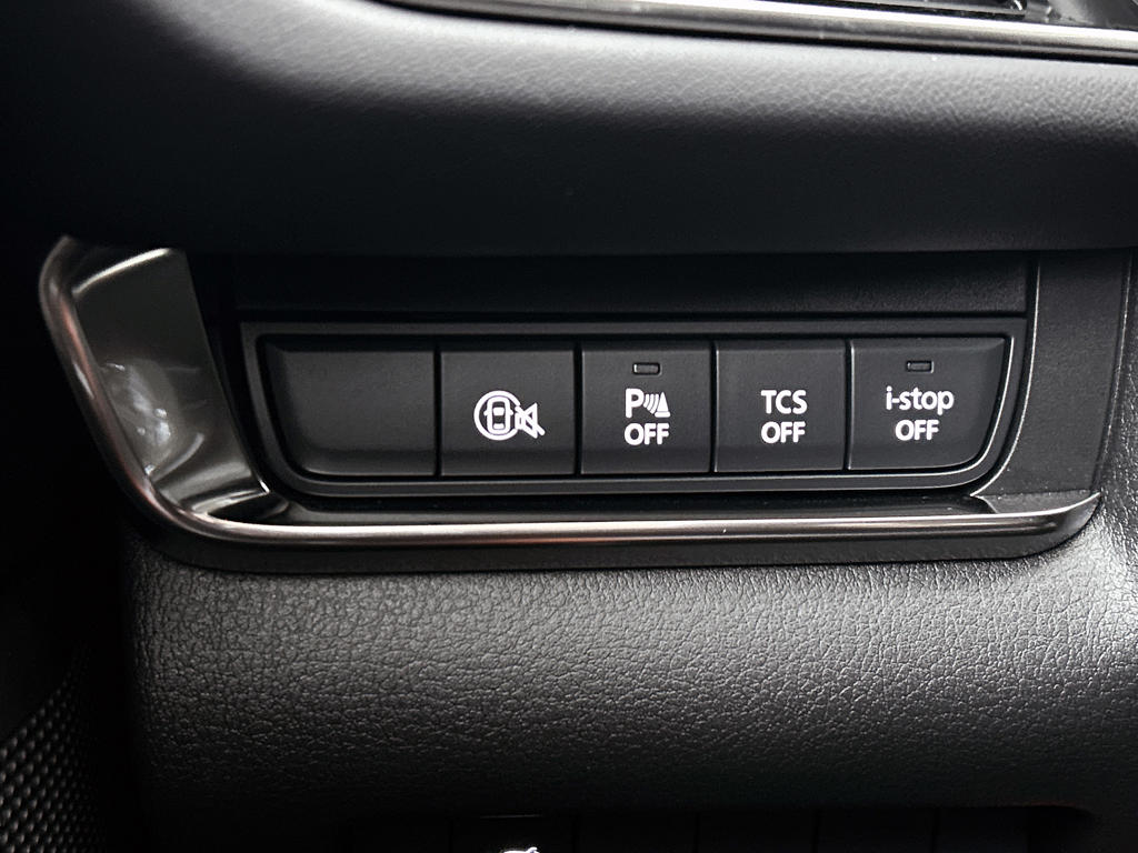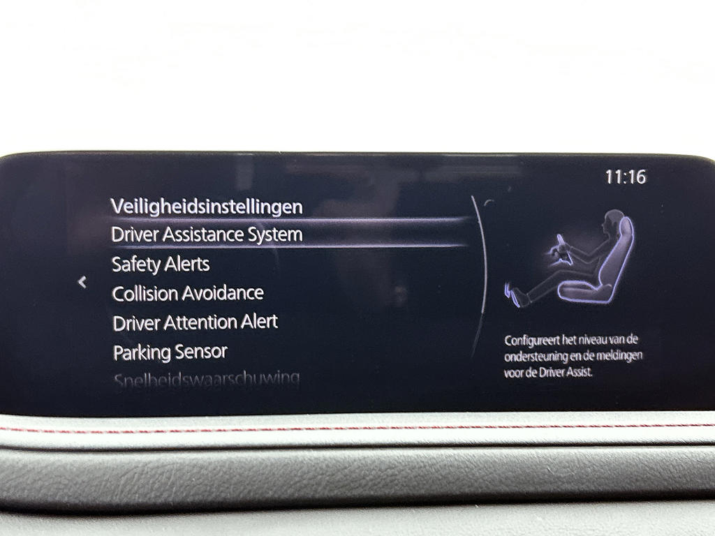 Als bestuurder van deze Mazda ben je nooit alleen. Je wordt onderweg bijgestaan door technologische hulpmiddelen die samen met jou de weg in de gaten houden. Als het nodig is, grijpen ze zelfs in, door te remmen of bij te sturen. Eyes on the road! Dat kan iedere seconde, dankzij de head-up display, die informatie projecteert op de voorruit. Verkeersbord-detectie herkent verkeersborden en toont deze op het instrumentarium van de auto. Het Lane-keeping systeem registreert permanent of je binnen de lijnen van de rijstrook blijft; dwaal je onbedoeld af, dan waarschuwt het systeem en corrigeert de koers. In deze Mazda vinden we verder een dodehoekdetectie, forward collision warning system, hill hold functie, brake assist, vermoeidheidsherkenning en bandenspanningcontrolesysteem.