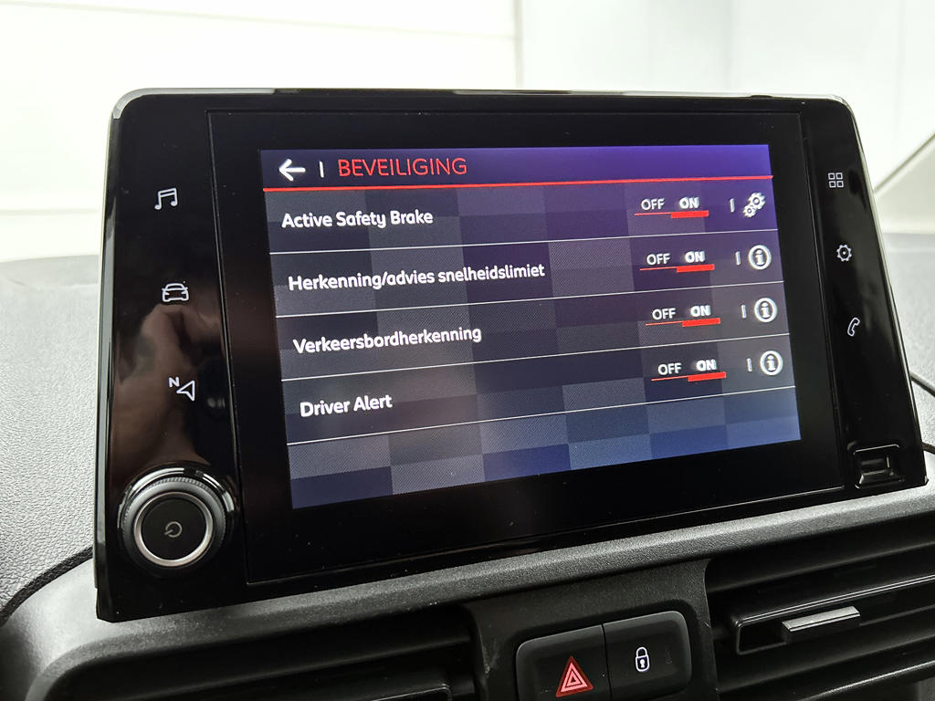 Zoals u mag verwachten van deze Citroën Berlingo XL is hij uitgerust met een reeks aan actieve veiligheidssystemen. In het instrumentarium ziet u tijdens de rit ook de belangrijkste verkeersborden aangegeven, die de auto automatisch voor u leest. Onbedoeld buiten de rijstrook raken wordt voorkomen door het Lane-keeping systeem. Forward collision warning waarschuwt bij een dreigende aanrijding met een voorligger. Dankzij veiligheidsvoorzieningen als head-up display, hill hold functie, brake assist, vermoeidheidsherkenning en bandenspanningcontrolesysteem, bent u steeds veilig onderweg.